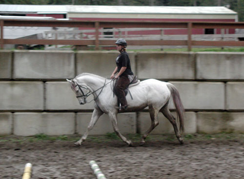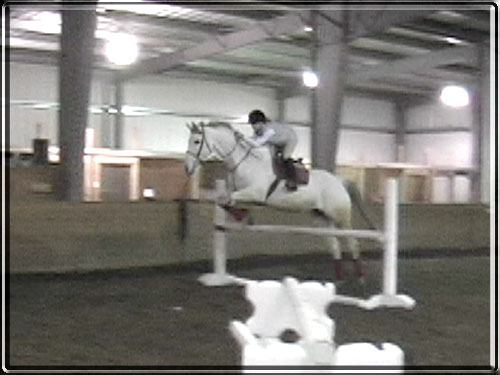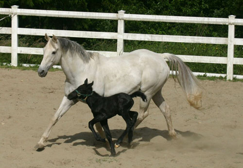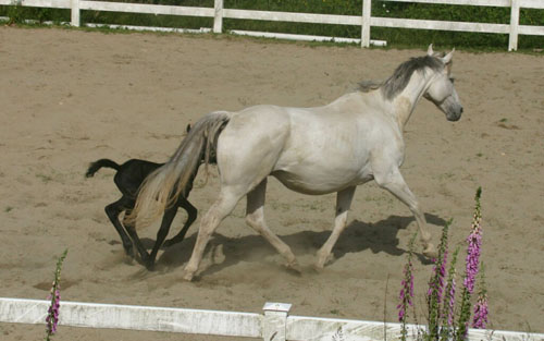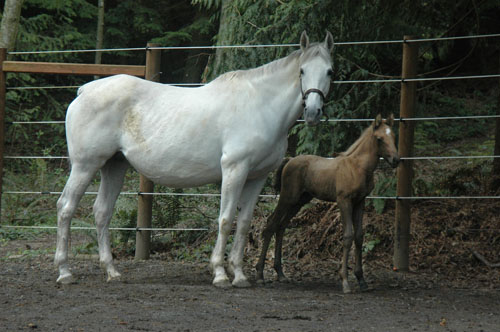Roxy is a 16.1hh grey TB mare, owned by one of our friends, Tiffany Sailer. I have always thought that she was wonderful, so we leased her for 2 foals. We got a lovely Draft Sporthorse filly named Freya, and a refined Warmblood filly by Yeager GF named Franka. Roxy is a sweet, honest mare with a real love for jumping. She is fun to ride and always tries to please.