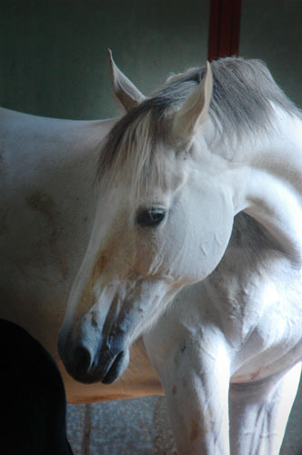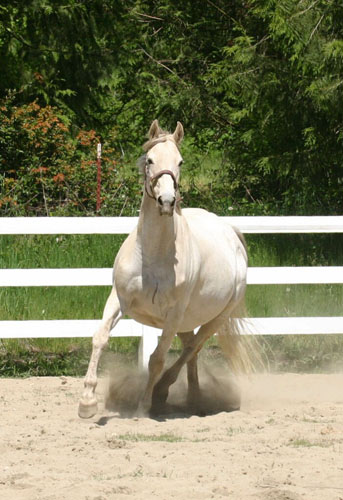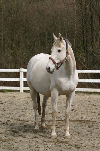 'Franka', is a Warmblood filly by Yeager GF. She is a super well balanced, elastic mover. She surprized us all by arriving with both a white mane and a black tail - DNA confirms that she is a sooty palomino, rare in warmbloods. She has a sweet, willing attitude and will do well in either dressage or jumping.